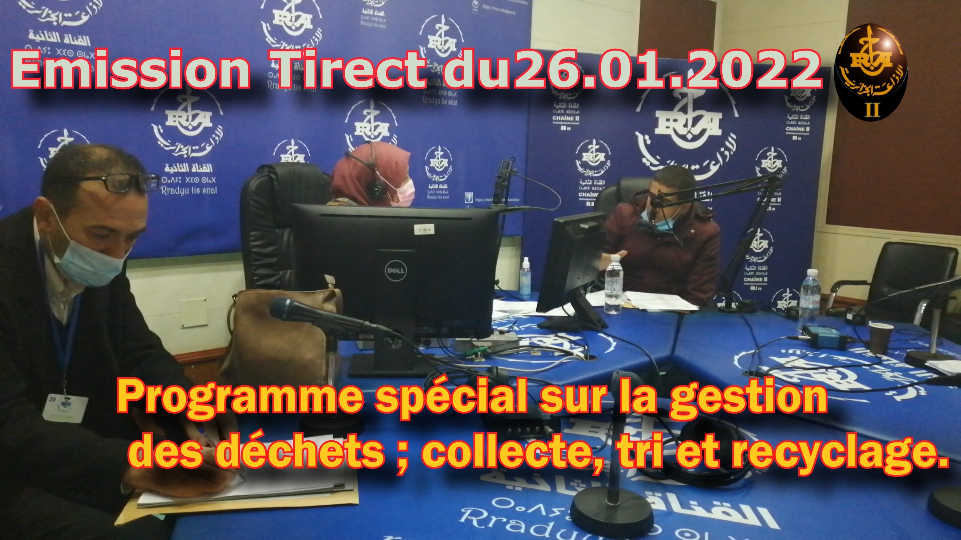 Programme spécial sur la gestion des déchets ; collecte, tri et recyclage. Les invités : Mr. Oulkhiari Mouloud ingénieur a l’AND, Mr. Sahi Samir CET « Nadhif » de Bouira, Bachir Chrif Mustafa responsable à NET.COM et Yasmina Boutaba représentante du Ministère de l’environnement.